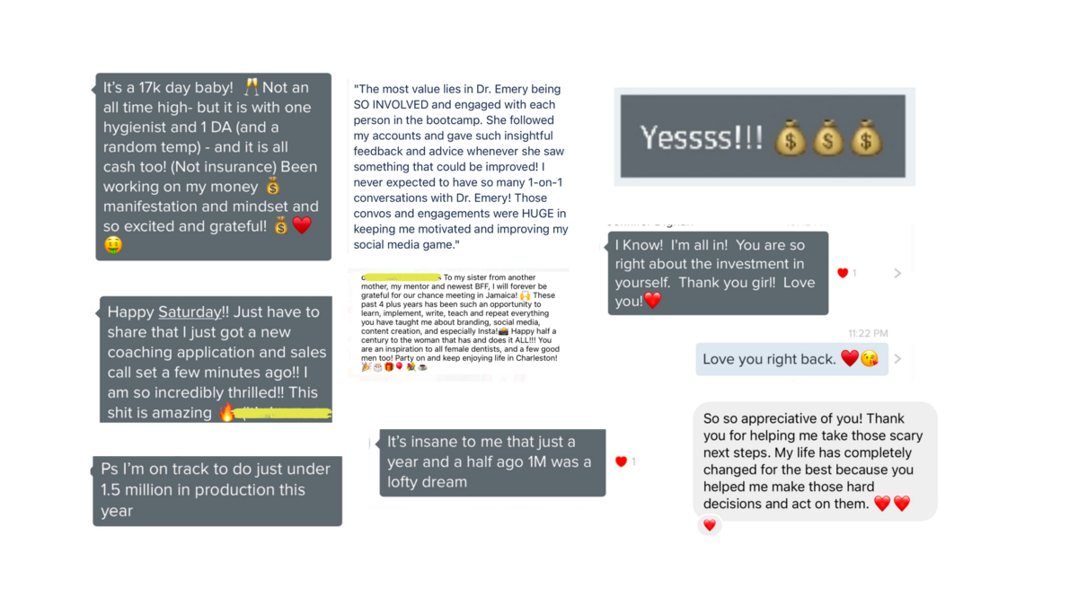 "This is the best decision I’ve made for my practice to grow. I called her my “Mary Poppins”! Being under Dr. Emery’s wing comes with a plethora of clinical and administrative knowledge, digital and clinical tools, office organization, streamlined manuals, the list goes on. I look forward to going to work every day because of her guidance and attention to detail. When you have an extra set of eyes, and Dr. Emery’s in particular, your opportunities broaden and become tangible. Her creative and authentic nature rubs off on you. She has helped me close multiple cases being able to foresee different vantage points. The investment is well worth it. I’m so glad I chose Dr. Emery to coach me and be in my corner. My practice flow and results have been shining through since we got started, it’s addicting to see so much growth in such little time."