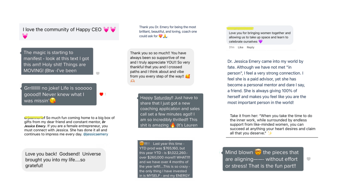 Spring forward a year and I have started a new business which is my hearts passion and in the process of transitioning from my current career to this new business - my dream profession. I would have never in a million years had the courage to go for it on my on. Happy CEO was the springboard of encouragement and support I needed to freaking GO for IT! So thankful for Dr. Jessica!